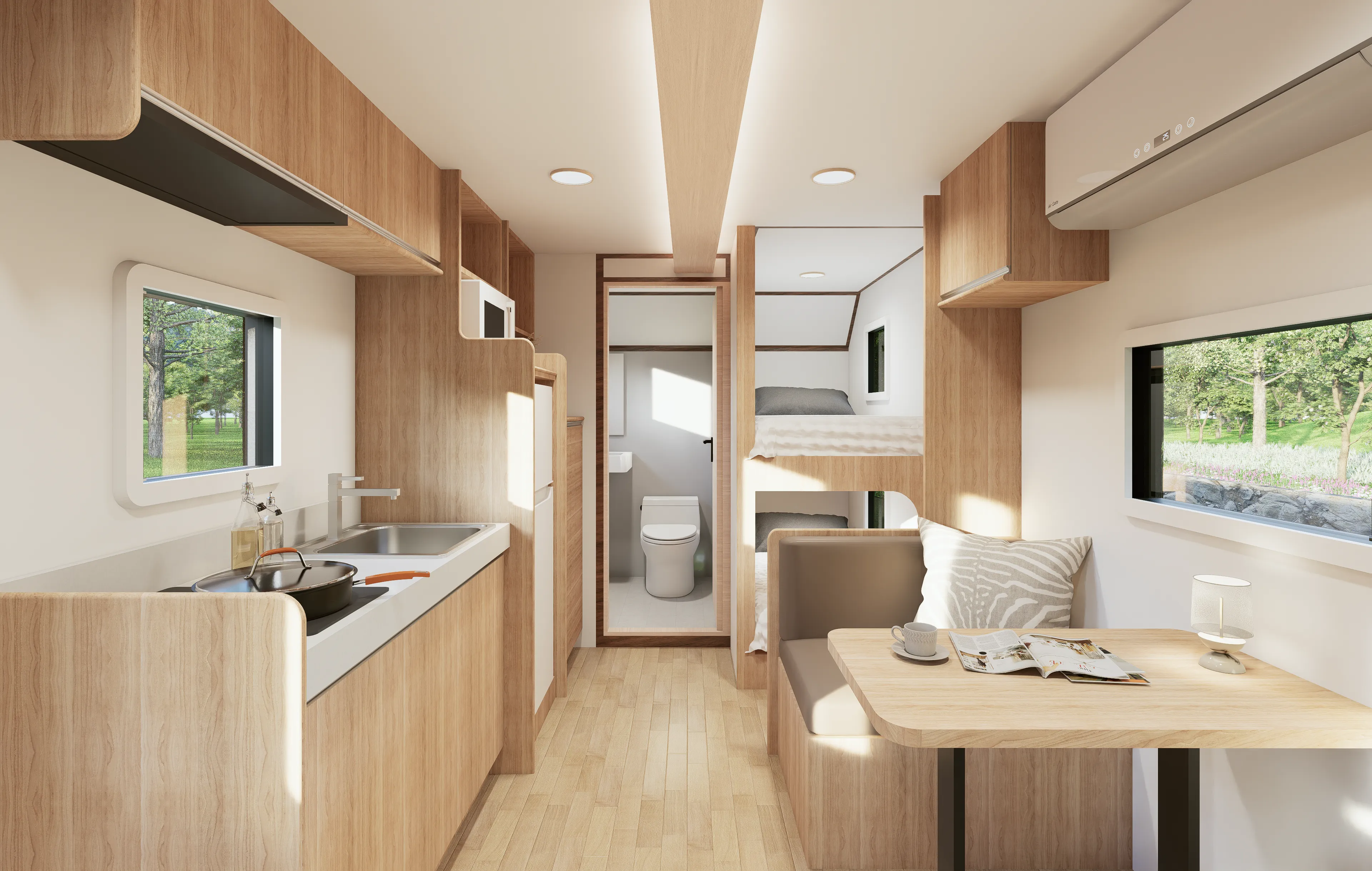 카라반과 모듈하우스에 차량 수준의 강한 내구성과 기밀성이 요구되는 구조물과 동일한 재질과 공법을 적용하여 프레임과 바디를 견고하게 결합하고, 전반적인 안정성과 내구성을 한층 높혔습니다. 또한 지속적인 연구개발로 완성도를 더욱 강화하고 있습니다.