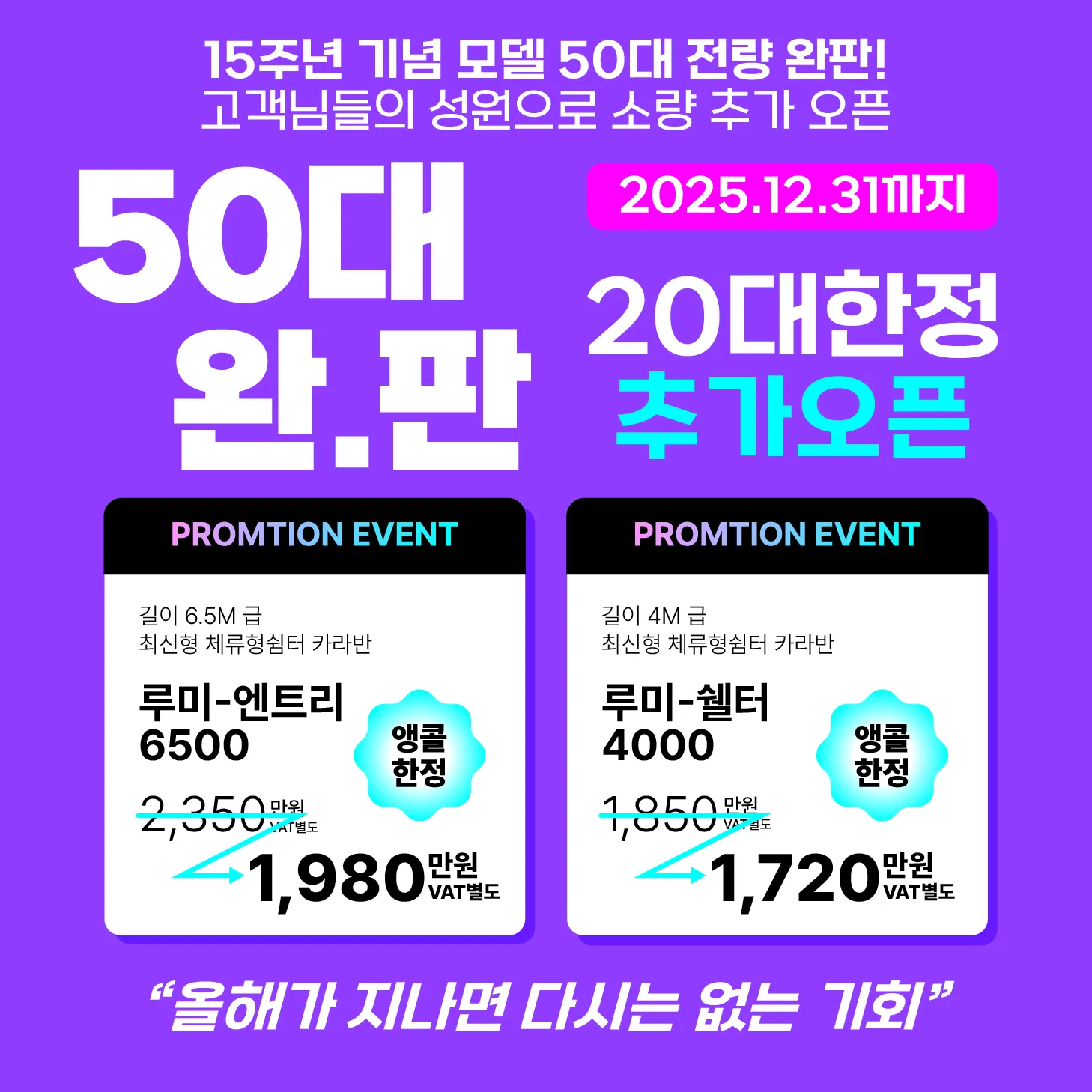 국내 카라반 제조/유통 14년 이상의 노하우를 통해 한국만의 산,바다지형 뿐만아니라 다변한 4계절 기후에 맞춘 설계로 국내 제조합니다.