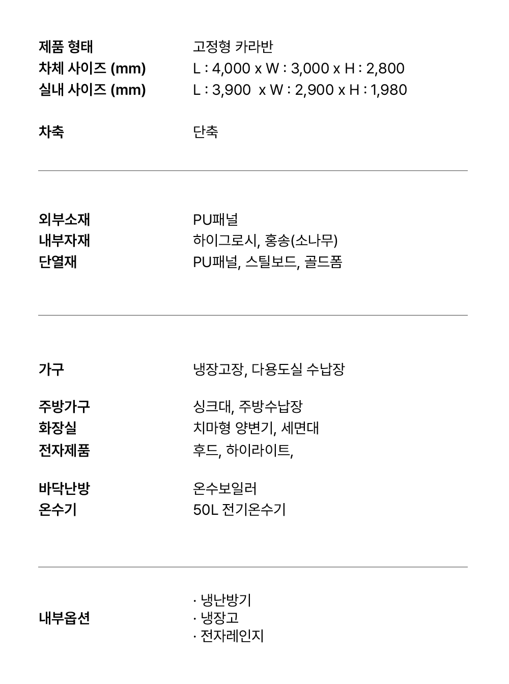 넓은 3m폭, 입체감있는 FRP, 내구성 강한 하이그로시로 제작된 정박형 카라반의 정석