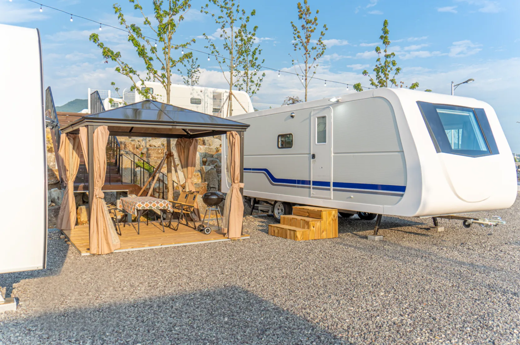 넓은 3m폭, 입체감있는 FRP, 내구성 강한 하이그로시로 제작된 정박형 카라반의 정석